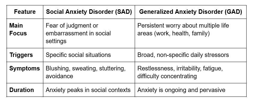 While both involve excessive anxiety, social anxiety is situation-specific, whereas generalized anxiety is persistent and wide-ranging. Correctly distinguishing between the two ensures appropriate interventions like cognitive-behavioral therapy (CBT) or exposure therapy.